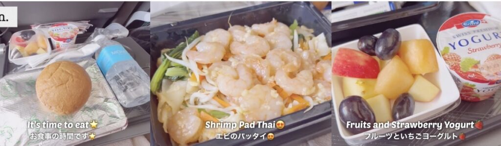 搭乗して2時間後に最初の機内食。海老のパッタイ、パン、フルーツとイチゴのヨーグルト🍓